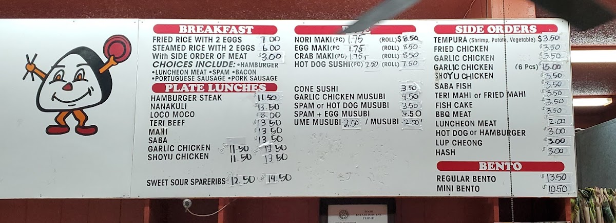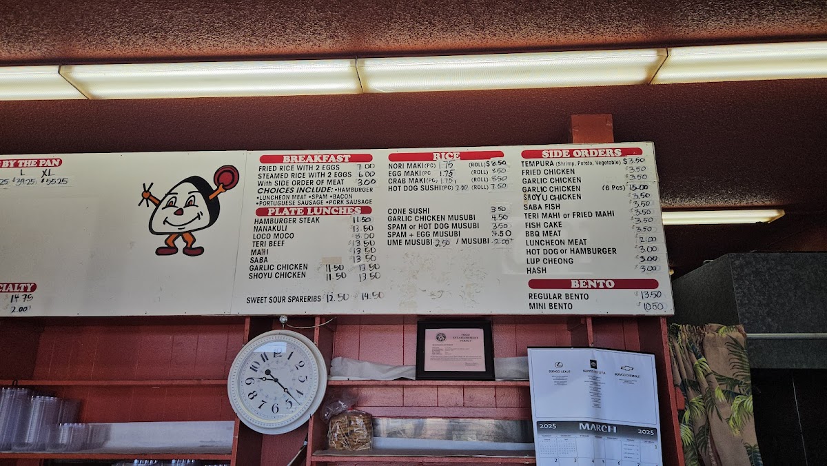 This menu structure supports quick ordering and takeout, making it suitable for early shifts or light meals throughout the day. The presence of diverse protein options and rice-based dishes accommodates a range of preferences typical in a Japanese delicatessen setting.